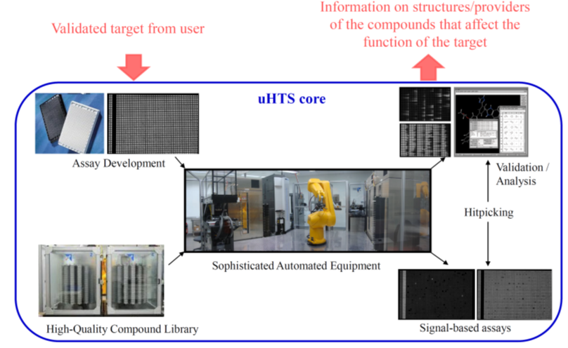 超高通量快速篩選核心(http://uhts.genomics.sinica.edu.tw)運用微量與高密度的實驗設計,搭配自動化設備來增加實驗的通量和速度。主要協助研究人員在具特色的化學分子庫中,找到具有特定生物活性的化學分子,以及協助定義及發現蛋白功能及分子機制。本設施之篩選技術可應用在: 1) 尋找可影響蛋白功能之專一化學分子,並藉由這樣的專一化學分子觀察蛋白質的功能與效應; 2) 尋找可影響已知細胞表現型(Phenotypes) 之專一化學分子,並藉由這樣的專一化學分子研究特定生物分子機制之起發與起始方向,加速研究進程。此核心設施對研究人員探索影響特定標的與其機制的研究,或是發展轉譯醫學的應用,皆扮演十分重要的角色。