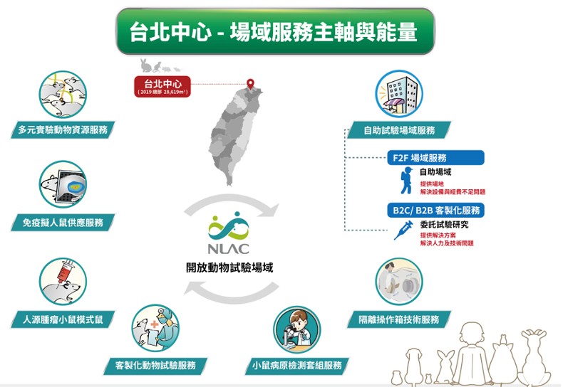 國家實驗動物中心 (台北中心) 提供服務項目包含有「多元實驗動物資源服務」、「自助試驗場域服務」、「隔離操作箱技術服務」、「客製化動物試驗服務」、「人源腫瘤小鼠模式庫」、「免疫擬人鼠供應服務」和「小鼠病原檢測套組服務」。