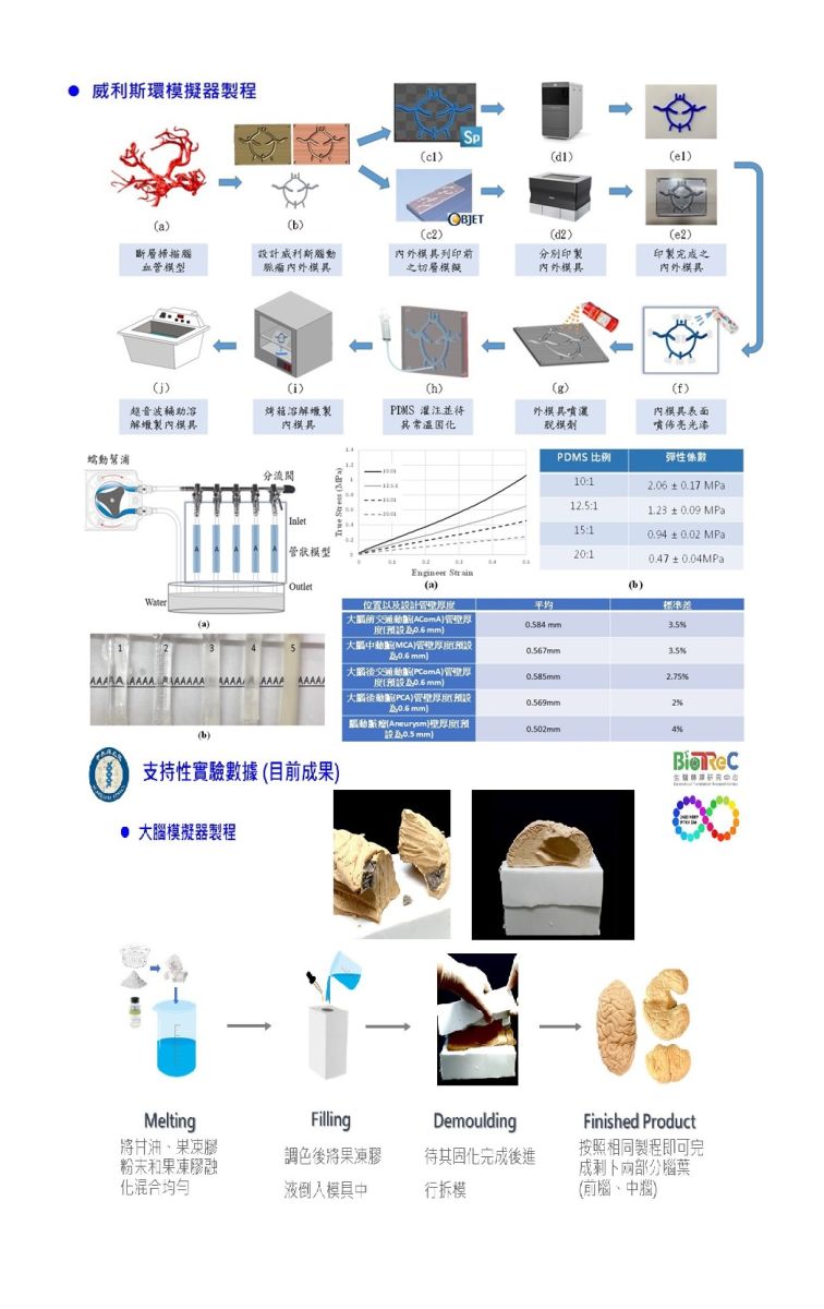 利用3D列印、模具設計、彈性材料澆注技術,開發3D腦部手術訓練擬真模擬系統,做為訓練夾閉腦血管瘤手術及移除腦瘤手術的模擬器,此模擬器包括頭顱、大腦軟組織、腦室、腦膜、以及一管壁厚度可控制、全透明的威利氏環腦血管脈管系統,並在發生機率較高的血管區段製做腦血管瘤及大腦軟組織做腦瘤,做為訓練學員的教具。
