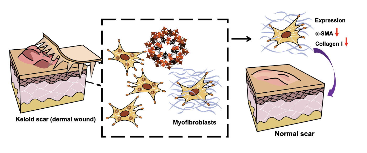 透過含有MIL-100(Fe)的微針貼片,將MIL-100(Fe)送進病灶內治療,蟹足腫纖維母細胞會進行細胞吞噬,進入纖維母細胞後的MIL-100(Fe)最終降低collagen I與SMA的表現,藉此達到治療蟹足腫的效果。
