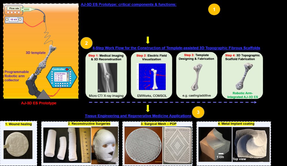 Work flow of proposed ideas. (1) components of AJ-3D ES platform to be prototyped. (2) 4-step work flow for the construction of 3D topographic fibrous scaffolds. (3) Proposed applications of 3D topographic fibrous scaffolds.