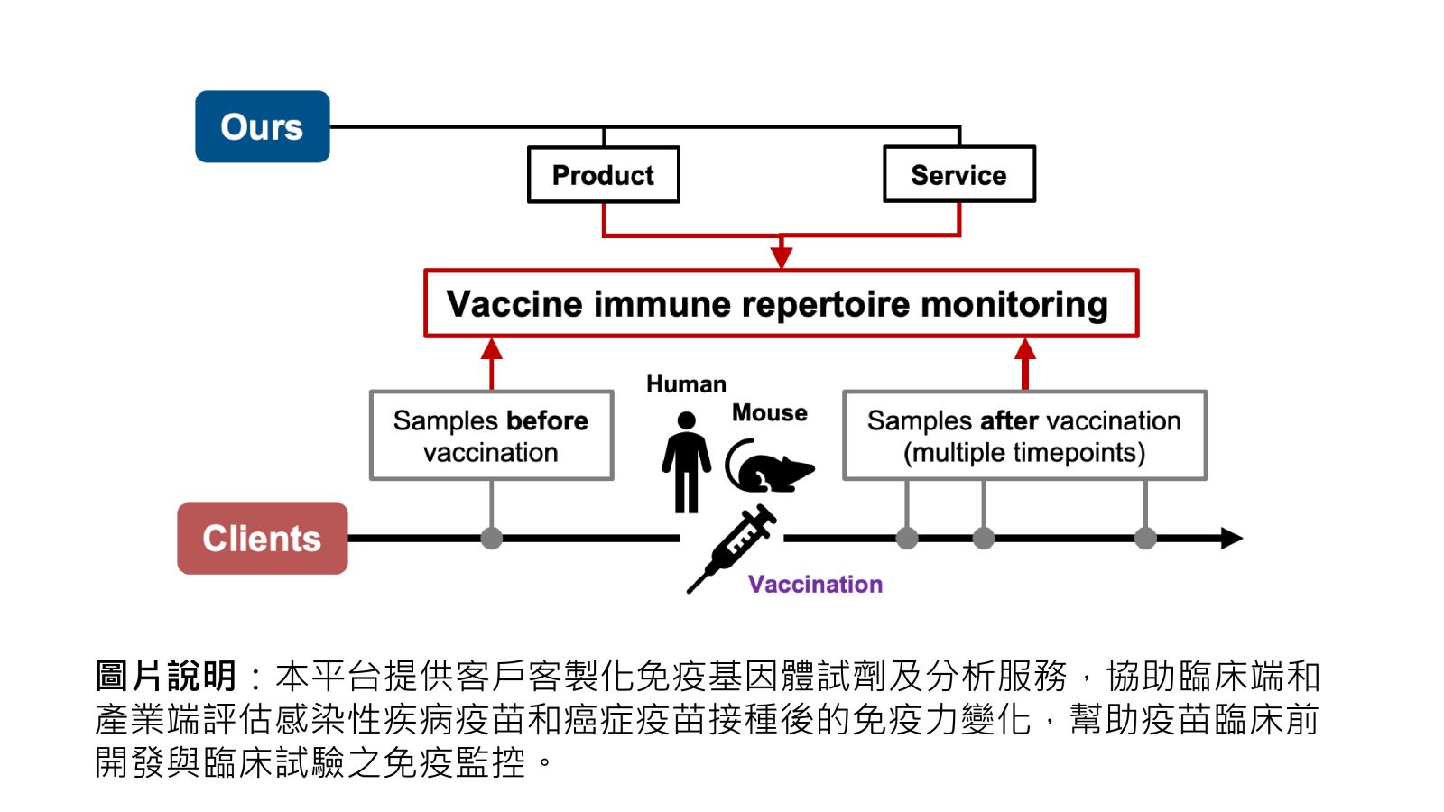 圖片說明:本平台提供客戶客製化免疫基因體試劑及分析服務,協助臨床端和產業端評估感染性疾病疫苗和癌症疫苗接種後的免疫力變化,幫助疫苗臨床前開發與臨床試驗之免疫監控。