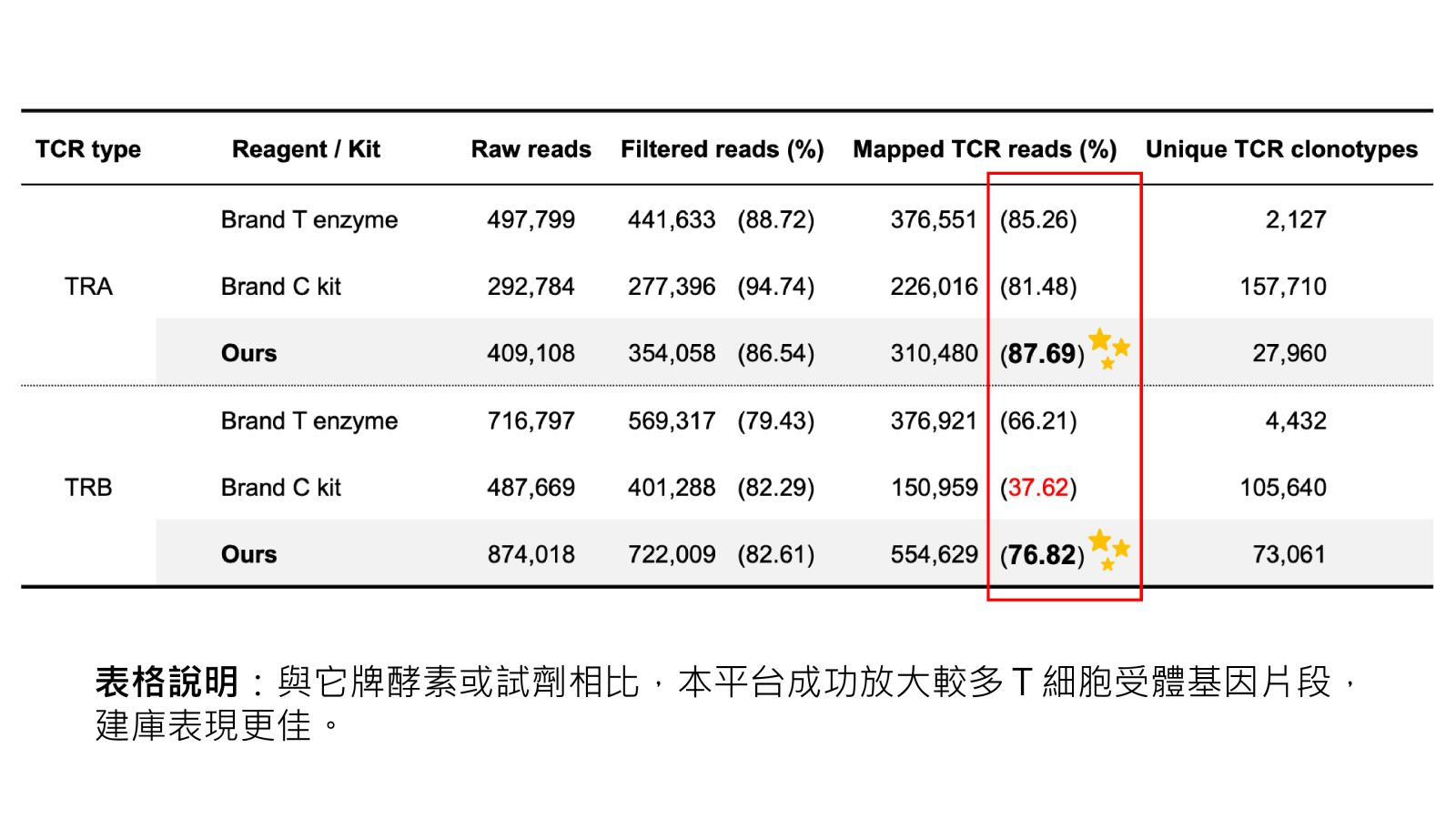 表格說明:與它牌酵素或試劑相比,本平台成功放大較多T細胞受體基因片段,建庫表現更佳。