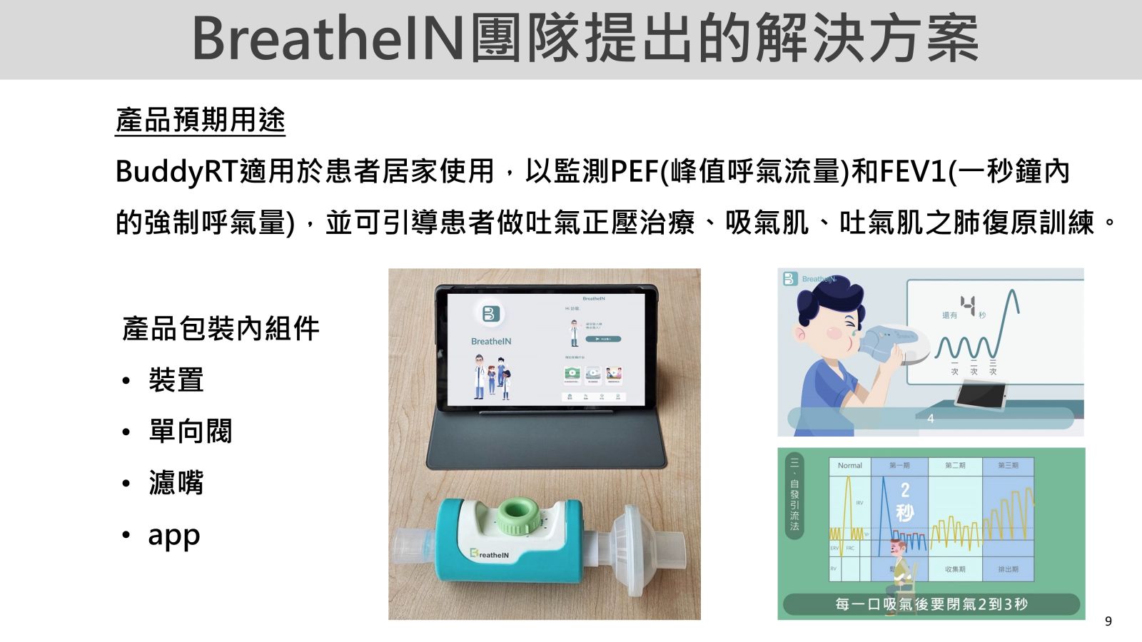 20居家呼吸監測與互動式肺復原臺北醫學大學.雙和醫院重症科曾健華副教授.主任發明人:曾健華領域:醫療器材適應症:BuddyRT適用於患者居家使用,以監測PEF(峰值呼氣流量)和FEV1(一秒鐘內的強制呼氣量),並可引導患者做吐氣正壓治療、吸氣肌、吐氣肌之肺復原訓練。研發階段:申請試驗用藥物/新醫材(試劑) Investigational New Drug (IND)/ Investigational Device Exemption (IDE) application摘要:當前全球面臨人口老化、空氣污染、傳染病擴散等問題,使呼吸系統疾病的醫療需求持續上升。根據WHO報告,全球前六大死因中有三個是與肺部疾病有關,每年約有650萬人死於此,數字持續增長。特別是肺阻塞患者由於缺乏自我監測工具和肺復原支持,容易急性惡化,增加急診和重症醫療的負擔。COVID-19疫情爆發後,居家照護趨勢明顯。研究顯示,每日監測呼氣流速可提前3天警示呼吸道疾病惡化,規律肺復原可減少急診次數,降低62.7%死亡率,正確吸藥也可減低57.2%死亡率。