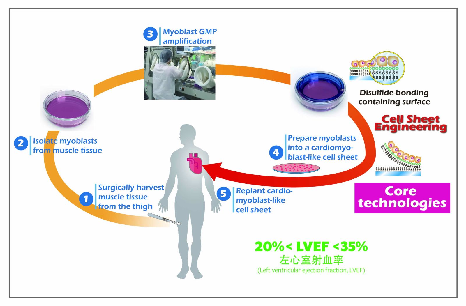 本圖所示的是治療嚴重缺血性心臟病用的左心室心肌重建整體過程。我們自行發展的新型細胞層片技術具有技術自主性也具有外溢性,開發至今已完成角膜上皮重建用細胞層片的全程製作與驗證,並藉經濟部學界科專計畫技轉至國內生醫公司。而現今最為重要的是驗證適用於治療嚴重缺血性心臟病用的左心室心肌重建,除具醫療需求性亦具市場規模;另,膝蓋軟骨細胞層片也正與國內知名生技公司合作開發中。