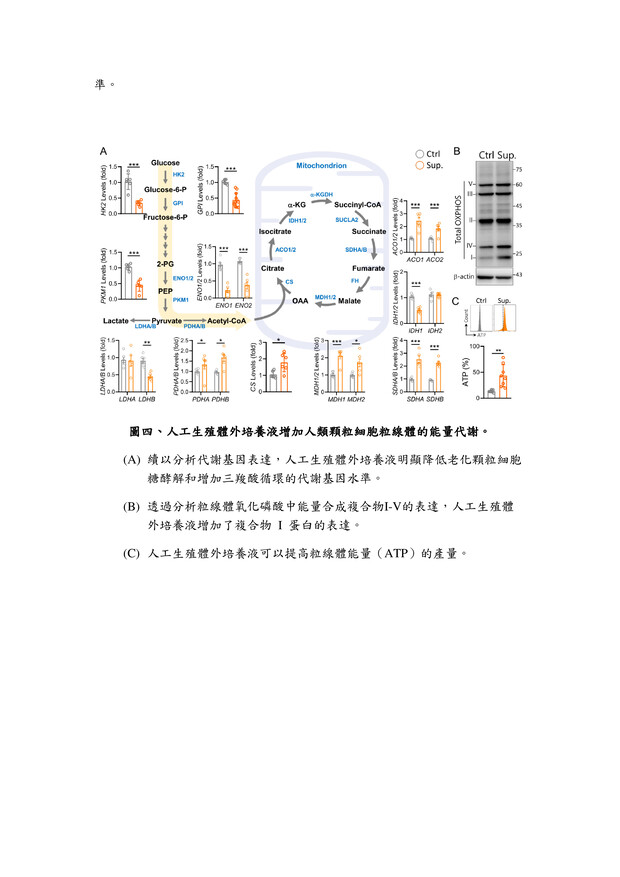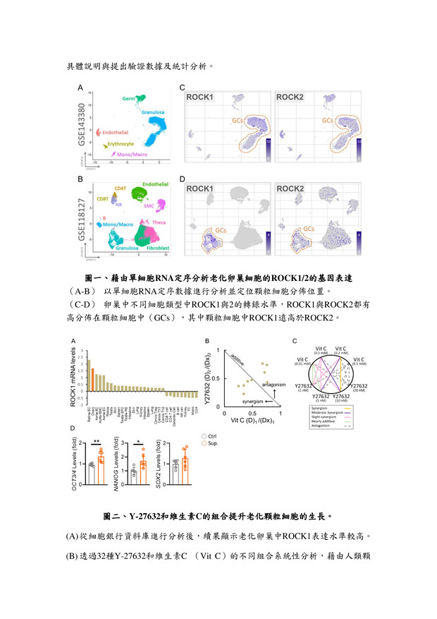 27高效生殖細胞培養液高雄榮民總醫院李佳榮副研究員發明人:李佳榮領域:輔助性材料適應症:人工生殖體外細胞培養研發階段:候選藥物/醫材雛型臨床前試驗 Preclinical trials摘要:台灣少子化問題日益嚴重,隨年齡增長,女性卵子的質量會不可逆轉地下降,導致生育能力下降,同時也增加了胚胎品質下降、流產風險升高。研究發現,生殖老化影響生殖細胞品質,還降低女性生育率。為改善此問題,我們開發一種高效的體外生育培養液,其中包括維生素C和ROCK抑制劑(Y-27632)。維生素C是強效的抗氧化劑,有助於減少氧化壓力,保護細胞不受損害。ROCK抑制劑Y-27632則有助提升細胞品質。經過系統性篩選,結果發現使用高效培養液的細胞能降低活性氧(ROS)生成,並重建細胞粒線體功能,有助改善細胞品質。這對提高體外受精的成功率,尤其對高齡女性而言,具有重要意義。這項研究為不孕患者提供了更有效的治療途徑,並對人工生育領域產生積極影響。