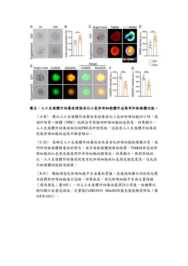 The problem of declining birth rates in Taiwan is becoming increasingly severe. With age, the quality of women's eggs irreversibly decreases, leading to reduced fertility, increased risks of embryo quality degradation, and higher chances of miscarriages. Research has found that reproductive aging not only affects the quality of reproductive cells but also decreases women's fertility rates. To address this issue, we have developed an efficient in vitro fertilization culture medium, including vitamin C and a ROCK inhibitor (Y-27632). Vitamin C acts as a potent antioxidant, reducing oxidative stress and protecting cells from damage. The ROCK inhibitor Y-27632 contributes to enhancing cell quality. Through systematic screening, the results have shown that cells cultured using the high-efficiency medium can reduce the generation of reactive oxygen species (ROS) and restore mitochondrial function, thereby improving cell quality. This is of great significance in increasing the success rate of in vitro fertilization, particularly for older women. This research provides a more effective treatment approach for infertility patients and has a positive impact on the field of assisted reproduction.