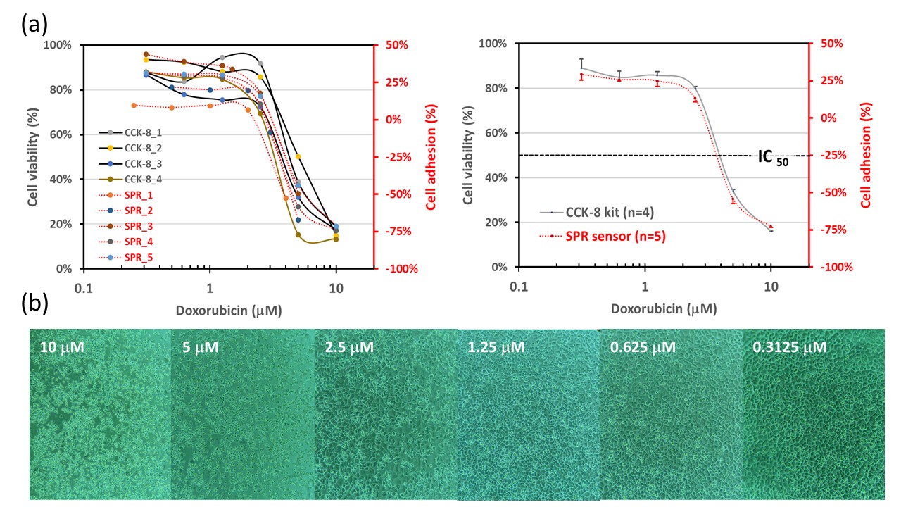 Comparative results of cytotoxicity tests with CCK-8 kit and SPR sensor testing.(a) The results indicate a consistent trend in cell viability and cell adhesion ratio with varying Doxorubicin concentrations, with an approximate half-inhibitory concentration of 4μM. (b) Images of CL1-0 cells after overnight incubation with varying Doxorubicin concentrations.