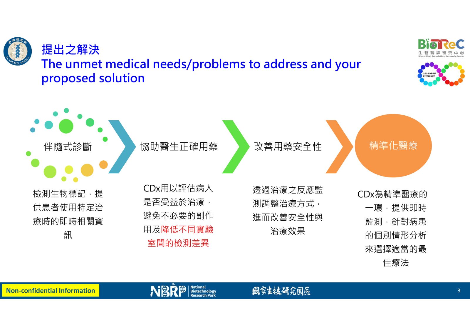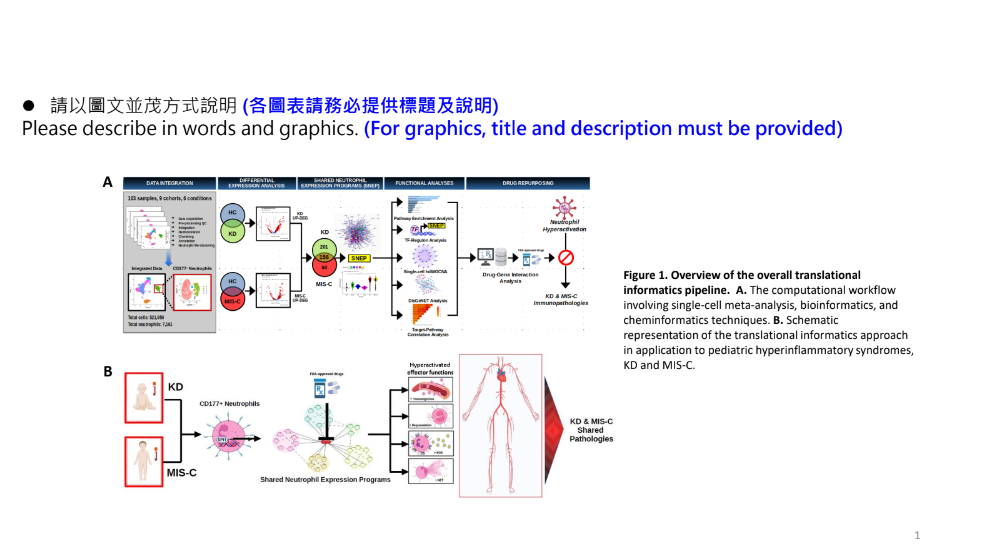 46細胞基因體數據驅動之新興與未知感染源藥物標靶快速鑑定平台國立陽明交通大學 /中央研究院生物醫學科學研究所柯泰名副教授 / 林哲民合聘助研究員發明人:柯泰名 簡文森 張兆良 林芳平 林哲民領域:醫療器材適應症:小兒血管炎研發階段:活性化合物/生物標誌確認 Hit compounds/biomarkers confirmation摘要:全球醫療保健產業正在努力應對發炎症候群和不明傳染原(例如川崎病 (KD) 和兒童多系統發炎症候群 (MIS-C))的挑戰。 儘管這些綜合徵有相似之處,但需要大量資源進行診斷和治療。迅速介入的緊迫性、有效療法的缺乏以及對綜合治療方法的需求加劇了醫療保健困境。為了滿足這些需求,引入了突破性的轉化醫學管道,旨在快速識別藥物標靶。該解決方案利用單細胞基因組數據,融合生物資訊學、系統生物學和化學資訊學,從而加快藥物發現過程,並有可能在細胞層面上解決病症。它的多功能性延伸到許多疾病,表明其具有廣泛的治療影響。該領域的趨勢強調大數據和計算方法在研發中的使用、公共單細胞數據的利用以及個人化醫療的發展。該技術因其在細胞層面逆轉疾病的潛力而脫穎而出,使其成為該領域無與倫比的解決方案。隨著全球健康危機凸顯了做好準備的必要性,該技術與利用數據分析和體學數據快速做出反應的推動相一致。 台灣以其一流的醫療保健而聞名,國內對此類先進解決方案的需求強勁。 市場預測表明,單細胞技術目前的價值為24 億美元,到2032 年可能會飆升至155 億美元。此外,計算生物學預計到2030 年將從29.6 億美元增長到令人印象深刻的348.7 億美元。具有成本效益的研發模式,承諾更快地進行藥物再利用和發現,並有能力提供整體治療解決方案。