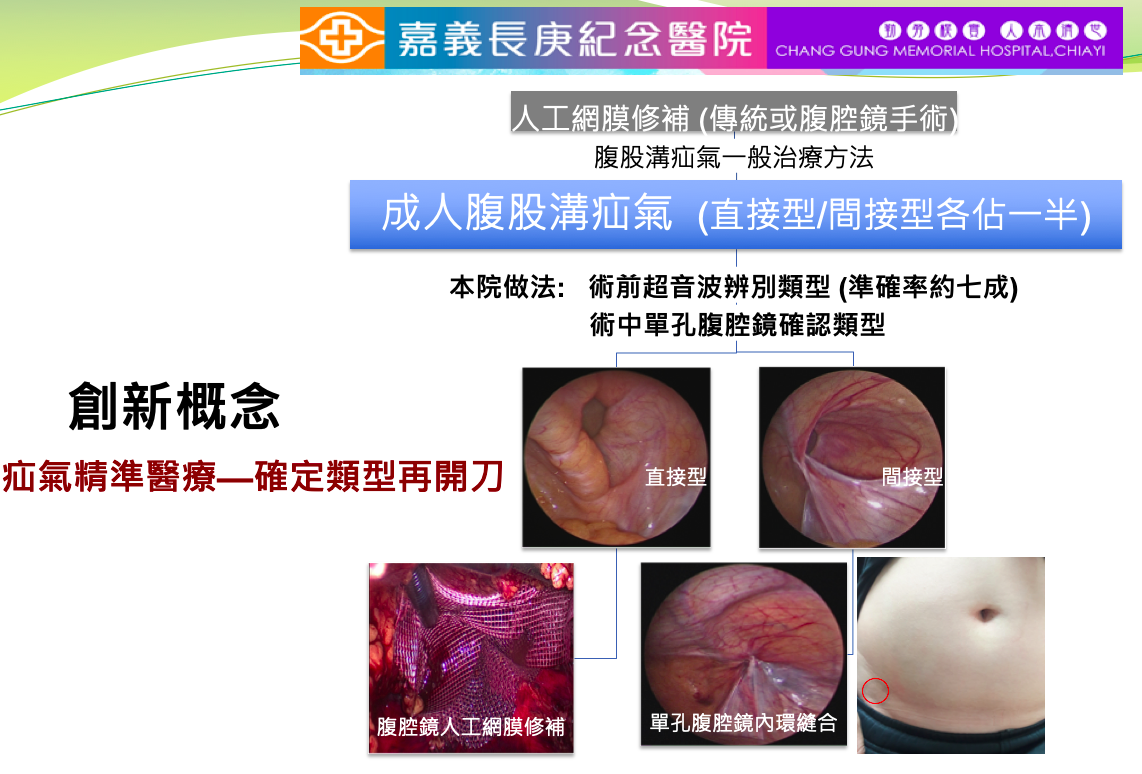 目前疝氣治療的觀念是一律要補上人工網膜(不論是傳統或微創手術),本團隊率先發展出根據類型做修補的創新概念,特別針對間接型疝氣的修補我們設計出"無網片式疝氣針",可讓絕大部份疝氣患者不必補上人工網片,手術時間短,術後不痛,免住院,並迅速恢復日常.