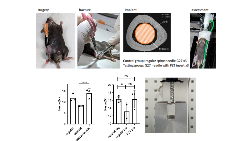 上:小鼠骨癒合動物實驗的四個階段: 手術、骨裂、植入、術後評估。下:小鼠腿骨術後的強度測試設備(右圖)、第一輪結果(左一圖)和第二輪結果(左二圖),強度測試的結果分三組: 正常腿骨(normal leg)、手術使用金屬骨材(regular pin)、手術使用壓電骨材(PZT pin)。