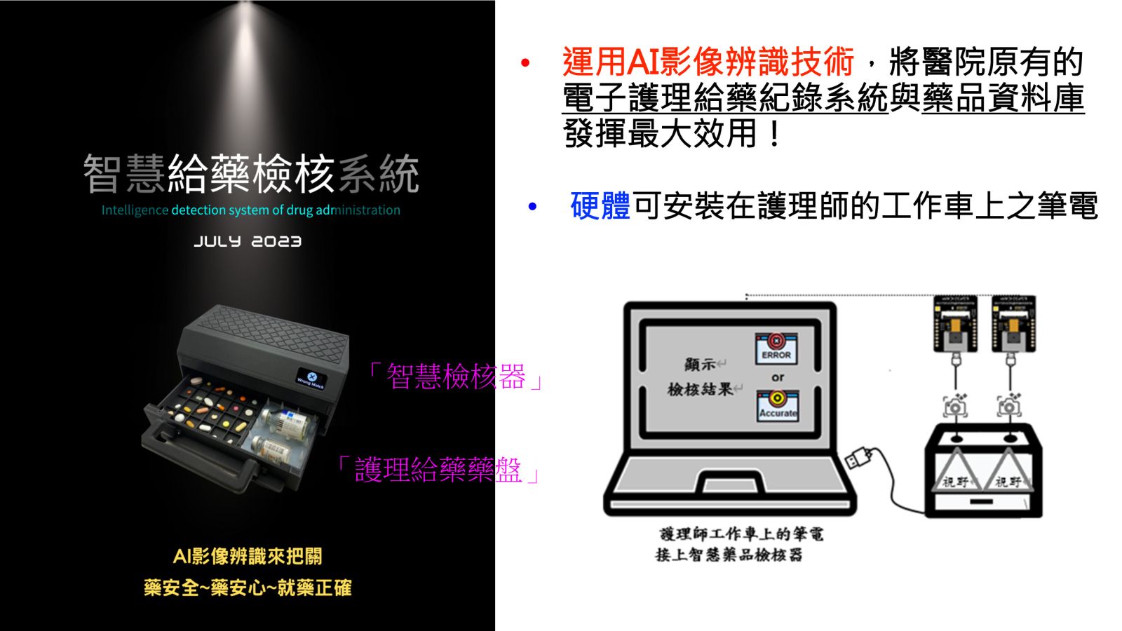 28智慧護理給藥檢核系統國立臺灣大學護理學系胡文郁教授發明人:李婉菱、朱育瑧、胡文郁、詹魁元、許雅婷、郭冠成、黃嗣棻、莊寶玉、高秀娥、郭哲安、王嬿淇、蕭妃秀 、黃織芬、孫慶耀、陳世英、陳達慶領域:醫療器材適應症:全球有“護理給藥業務需求”之機構,如醫學中心/區域/地區醫院研發階段:醫材雛型開發Prototype development摘要:美國每年約130萬人因用藥錯誤受到傷害,成本估計為420億美元。在臺灣根據醫策會病人安全通報系統統計,護理給藥階段常見錯誤主要為劑量、頻率、名稱錯誤,是病安重要議題。彙整臺灣近十年護理給藥階段異常件數皆為約5,000件,顯示問題尚未被解決,給藥是護理師最頻繁的業務,僅用人工進行核對藥品,易受多重因素而發生錯誤,故引發本團隊運用AI影像辨識技術,首創「智慧給藥辨識系統」,可檢視護理師「實際拿取的藥物」與「電子醫囑」一致性,若有誤可即時阻止,將可避免大於70%的給藥錯誤類別,且透過應用程式介面(API)可輕鬆串接任一電子給藥系統,是繼2000年美國醫院將條碼導入護理給藥,進行電子檢核的另一新選擇,將可大幅提升病人用藥安全。