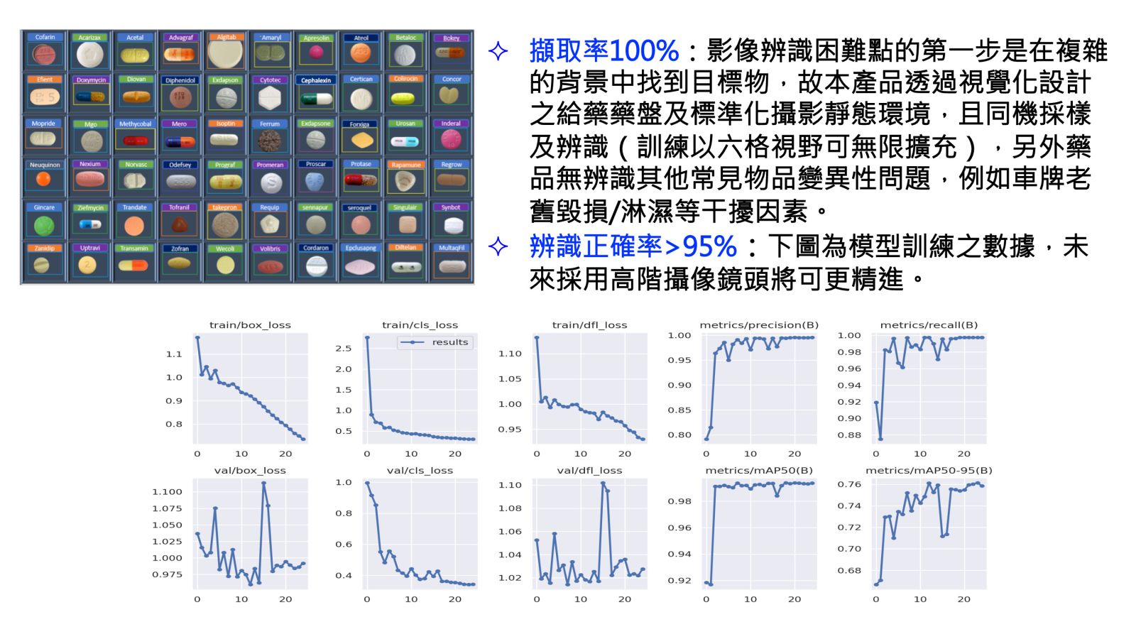 Prototype階段:擷取率達100%以及辨識正確率>95%(附上模型訓練之數據,未來採用高階攝像鏡頭將可更精進)。