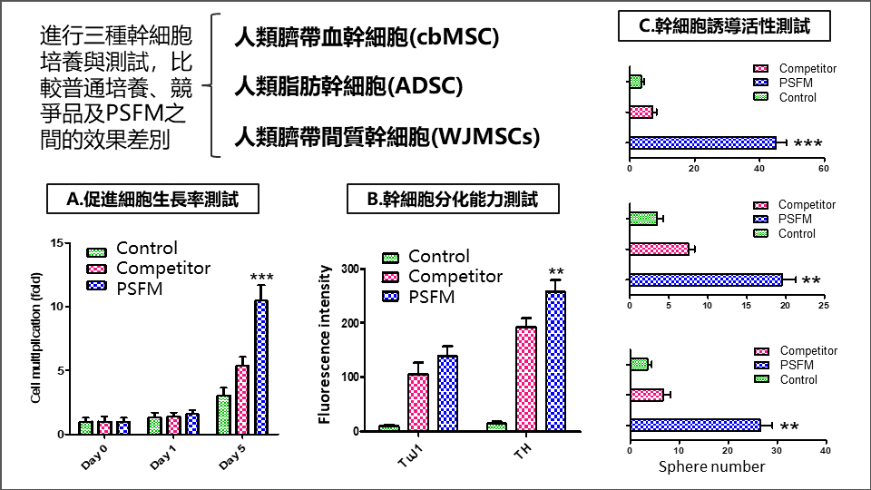 Regenerative medicine applications are becoming increasingly widespread. Currently, stem cells can be used in the treatment of various diseases, drug development, and the 3D bioprinting of organs. The global stem cell market is estimated to reach $261 billion by the year 2030. Most stem cell technologies require a process of cell culture amplification for their applications. After a decade of research on the impact of gene regulation on cell replication and differentiation capabilities, our team has developed a serum-free cell culture product line - PSFM that enhances stem cell capabilities through physical characteristics. Differing from conventional products that mainly focus on altering cellular properties through chemical stimuli for cell activation, PSFM primarily relies on a combination of compounds to provide effective and stable induction of cellular activation through physical stimuli. Ultimately, this leads to enhanced stem cell replication and differentiation. Our next step is to obtain a Class II medical device certification for the product, allowing PSFM to be used in clinical treatments in the future. Compared to past technologies and products, PSFM possesses an exceptionally high level of novelty and distinctiveness.