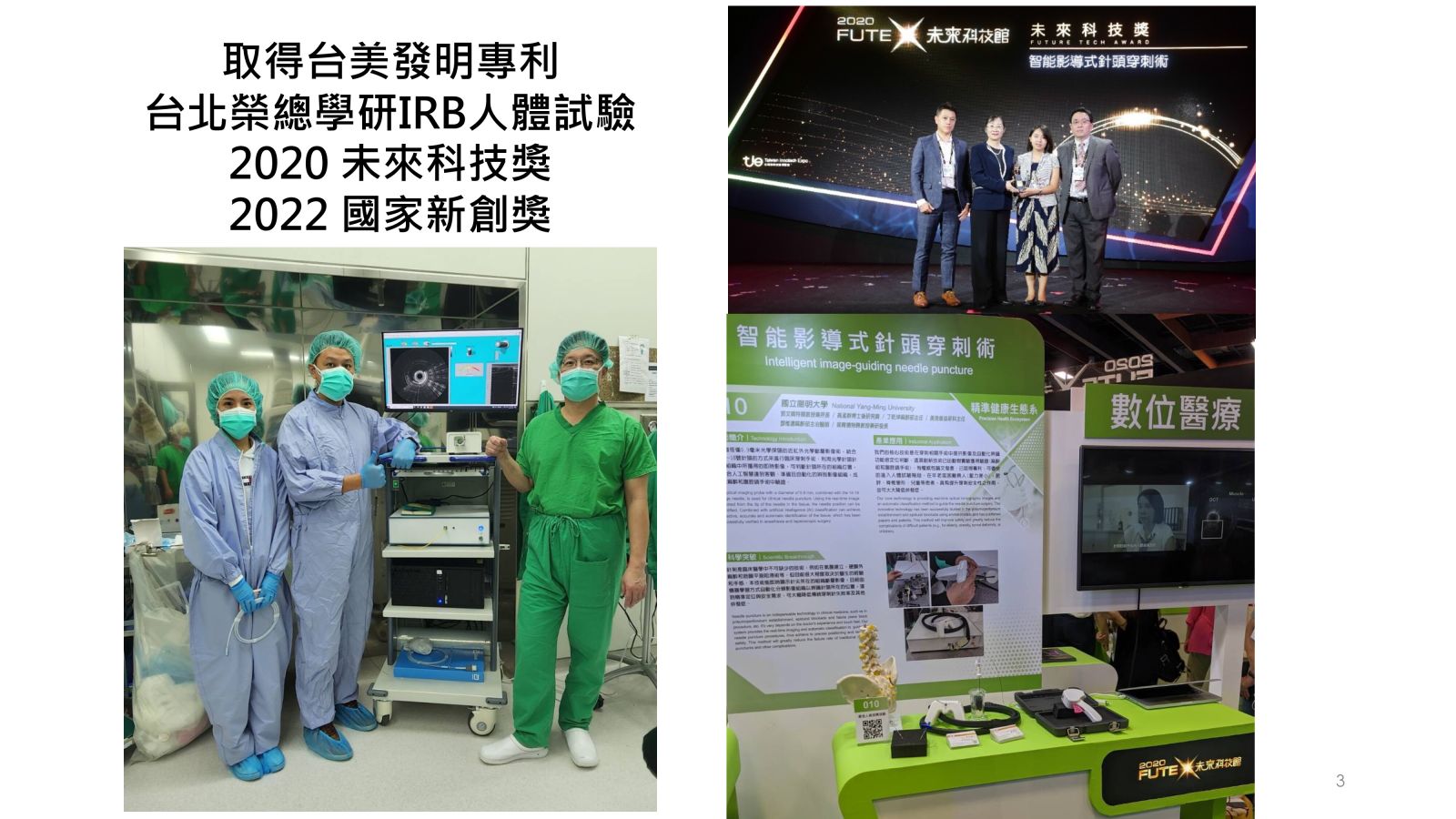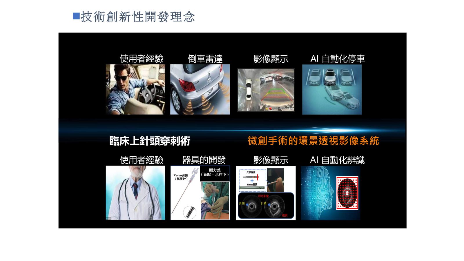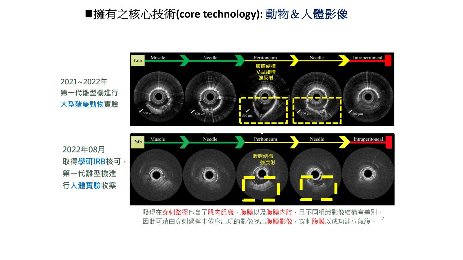 29影像引導氣腹針穿刺術於腹腔鏡手術之氣腹建立國立陽明交通大學郭文娟生醫光電所所長發明人:郭文娟/高孟群/黃逸修領域:醫療器材適應症:腹腔鏡手術之氣腹建立研發階段:2022進行了學研IRB進行10位人體實驗影像收案摘要:腹腔鏡檢查已廣泛應用於許多外科手術,而進入腹腔並形成氣腹,是每個腹腔鏡手術的關鍵第一步。判斷Veress氣腹針是否成功穿刺過腹膜而安全進入腹腔,目前主要仰賴臨床醫師經驗加以判斷,這個作法潛藏風險。在針穿刺腹膜的過程中,盲視插針對於內臟和血管損傷的風險,已知造成至少有一半的主要併發症發生於手術開始之前。這顯示確認氣腹針進入腹腔的步驟,對於成功的腹腔鏡手術至關重要。基於此臨床痛點,我們開發了光學影像引導探針的技術,以即時視別氣腹針的針尖位置。而此技術將氣腹建立由盲刺轉為可視化程序,因而大幅提升氣腹建立的有效及安全性。